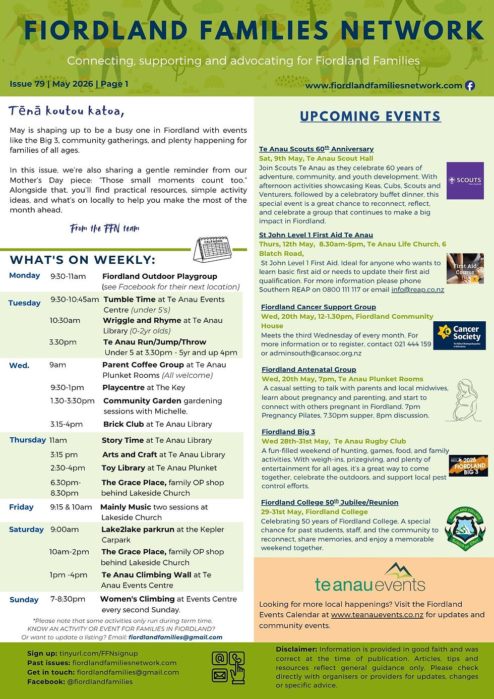 As the days cool down, this month’s issue brings together what’s happening around Fiordland, along with a few gentle reminders and ideas for home. From the Fiordland Big 3 to a Mother’s Day reflection, a simple activity, and practical parenting support it’s all about staying connected in the small and meaningful ways.